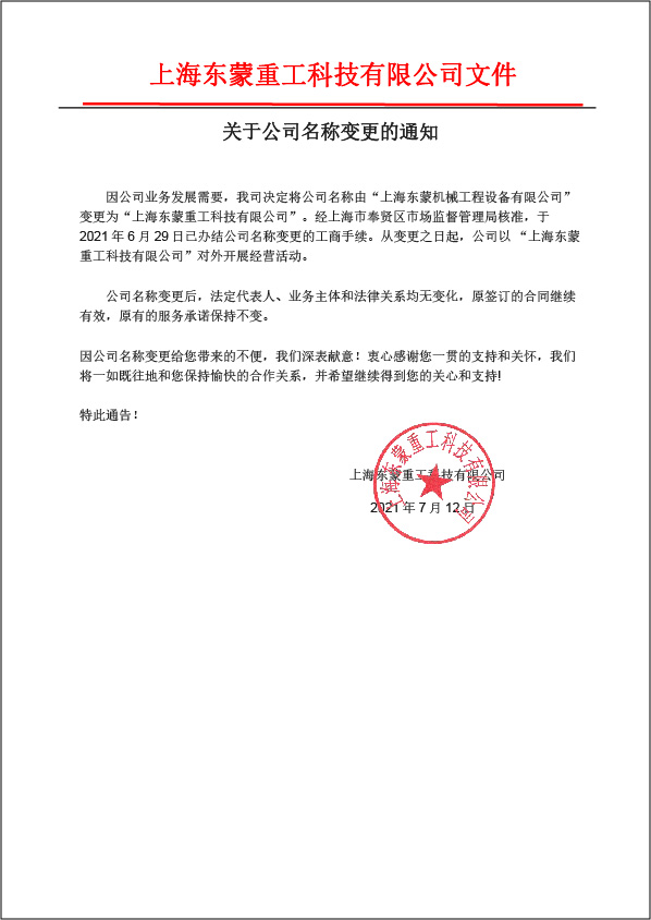 因公司業(yè)務(wù)發(fā)展需要,我司決定將公司名稱由上海東蒙機(jī)械工程設(shè)備有限公司變更為上海東蒙重工科技有限公司