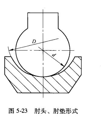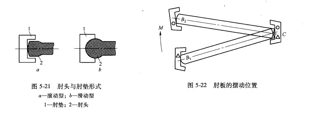 肘頭與肘墊的結(jié)構(gòu)形式,一般有兩種:滾動(dòng)型(滾動(dòng)副)和滑動(dòng)型(滑動(dòng)副),如圖5-21所示現(xiàn)以滾動(dòng)型為例,說(shuō)明肘頭與肘墊相對(duì)運(yùn)動(dòng)與受力情況(圖5-22)。在破碎機(jī)工作時(shí),破碎力的分力,經(jīng)肘墊壓向肘板最后由肘墊C支撐。與此同時(shí),動(dòng)顎通過(guò)肘墊給肘板一個(gè)擺動(dòng)力矩M,在此力矩作用下,肘板繞著C點(diǎn),從極限位置B1擺到極限位置B2在位置B1時(shí),肘頭滾到△點(diǎn)與肘墊接觸;在位置B2時(shí),肘頭滾到O點(diǎn)與肘墊接觸,如此往返運(yùn)動(dòng)。變肘頭與肘墊滑動(dòng)型為滾動(dòng)(圖5-23),根據(jù)對(duì)肘頭與肘墊相對(duì)運(yùn)動(dòng)分析可知若D越大,肘頭在肘墊里滾動(dòng)運(yùn)動(dòng)的區(qū)域也越大;若D-d越小,則肘頭在肘墊里滾動(dòng)D的區(qū)域也越??;若D-d很小,即采用配合尺寸,則肘頭在肘墊里幾乎處于完全滑動(dòng)此為滑動(dòng)副;若一“大到一定程度,可變滑動(dòng)為滾動(dòng),一般可取D-dD=0.35~0.4即可(圖5-23)。