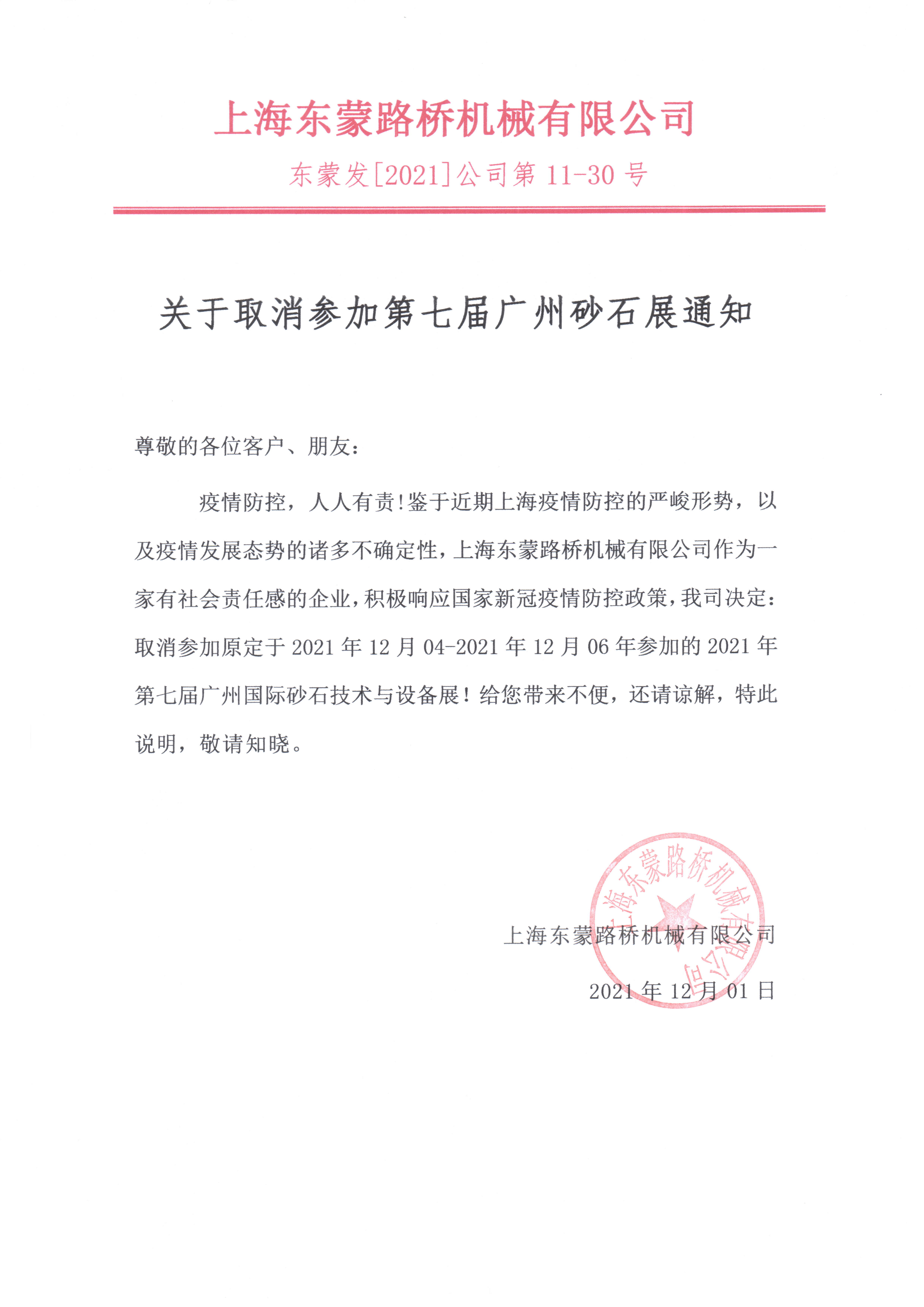 展會(huì)取消通知 :為配合疫情防控政策,上海東蒙路橋機(jī)械有限公司不參加2021第七屆國(guó)際砂石展活動(dòng)!來(lái)日方長(zhǎng)我們?nèi)蘸笤偌s!